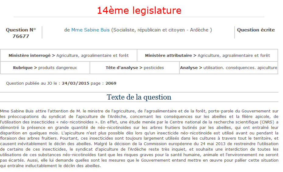 Je suis également signataire de la proposition de résolution relative à la préservation des insectes pollinisateurs, de l’environnement et de la santé et à un moratoire sur les pesticides de la famille des néonicotinoïdes, que vous pouvez consulter en suivant ce lien :