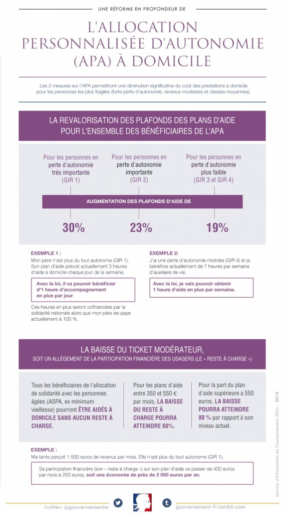 - L’allocation personnalisée d’autonomie est revalorisée, afin de favoriser le maintien à domicile des personnes en perte d’autonomie et de mieux soutenir leurs proches aidants. Le décret faisant suite à la loi vieillissement prévoit notamment une baisse du reste à charge pour 600 000 bénéficiaires (86% des bénéficiaires de l’APA), jusqu’à 80%, pour une économie moyenne de 400 € par an. Il prévoit aussi une revalorisation des plafonds d’aides pour 180 000 personnes : cela permettra une heure de plus par jour pour les plus dépendants, et une heure de plus par semaine pour ceux qui le sont le moins. Le décret simplifie par ailleurs l’attribution des cartes d’invalidité et de stationnement pour les bénéficiaires. Par exemple, pour une personne très dépendante disposant de 1 500 euros de revenus mensuels et avec un plan d’aide au plafond, le reste à charge passera de 400 à 250 euros, soit une économie de 1 800 euros par an.