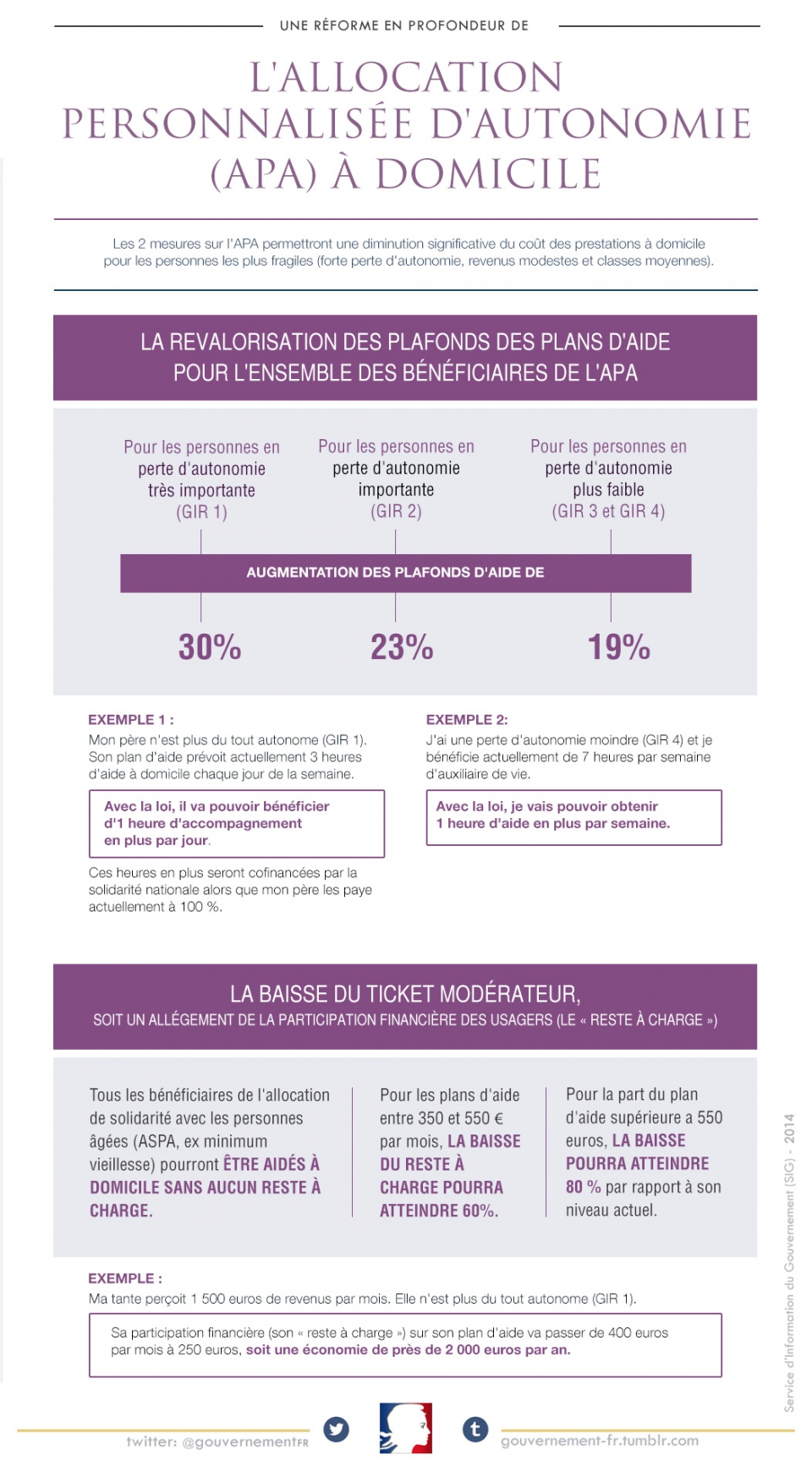 - L’allocation personnalisée d’autonomie est revalorisée, afin de favoriser le maintien à domicile des personnes en perte d’autonomie et de mieux soutenir leurs proches aidants. Le décret faisant suite à la loi vieillissement prévoit notamment une baisse du reste à charge pour 600 000 bénéficiaires (86% des bénéficiaires de l’APA), jusqu’à 80%, pour une économie moyenne de 400 € par an. Il prévoit aussi une revalorisation des plafonds d’aides pour 180 000 personnes : cela permettra une heure de plus par jour pour les plus dépendants, et une heure de plus par semaine pour ceux qui le sont le moins. Le décret simplifie par ailleurs l’attribution des cartes d’invalidité et de stationnement pour les bénéficiaires.
