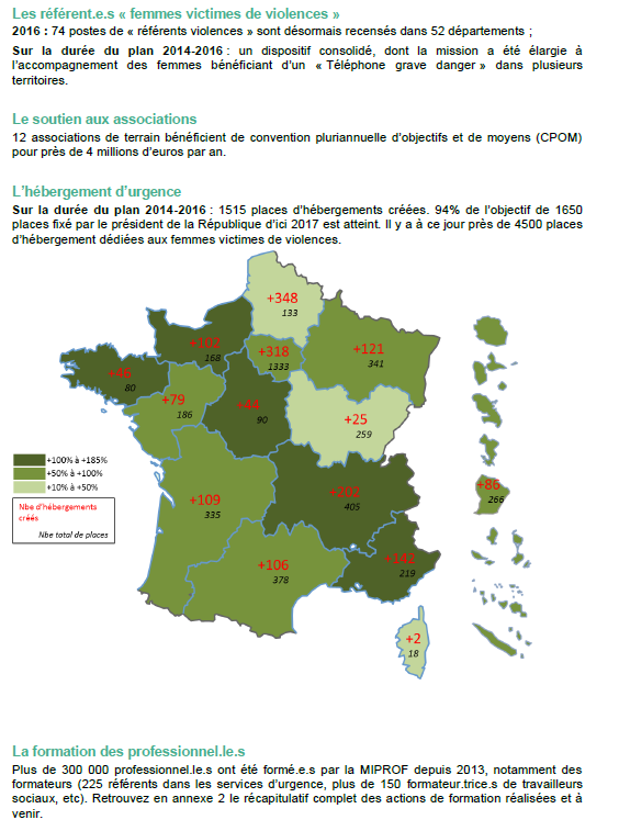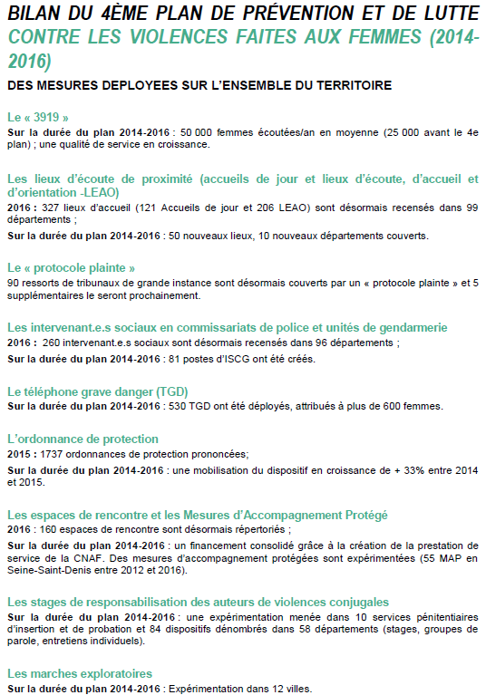 Des progrès considérables ont été réalisés grâce au 4ème plan de prévention et de lutte contre les violences faites aux femmes (2014-2016). Les violences sont mieux repérées et les victimes mieux prises en charge. Les violences faites aux femmes sont désormais mieux connues et davantage dénoncées. La tolérance sociale diminue.
